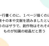 一行書くのに、1ページ描くのに数十の本や文献を読みましたというのはザラで、創作物はそれそのものが知識の結晶だと思う