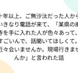 十年以上、ご無沙汰だった人からいきなり電話が来て、「某県の廃寺を手に入れた人が色々あって、すごいんで、話聞いてほしくて。近々会いませんか。現場行きませんか」と言われた話
