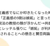 正義感でなにか叩きたくなった時「正義感の9割は嫉妬」と言った税法の教授の顔が浮かんだ→共感とレッテル張りに「嫉妬」が利用されることへの懸念と賛否両論