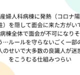 産婦人科病棟に発熱(コロナ陽性)を隠して面会に来た方がいて病棟全体で面会が不可になりそう…ルールを守らないごく一部の人のせいで大多数の良識人が迷惑をこうむる仕組みつらい