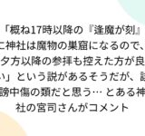 「概ね17時以降の『逢魔が刻』に神社は魔物の巣窟になるので、夕方以降の参拝も控えた方が良い」という説があるそうだが、誹謗中傷の類だと思う… とある神社の宮司さんがコメント