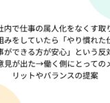 社内で仕事の属人化をなくす取り組みをしていたら「やり慣れた仕事ができる方が安心」という反対意見が出た→働く側にとってのメリットやバランスの提案