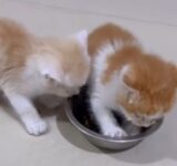 絶対にごはんを独占したい子猫…体を張って鉄壁ガード(動画)