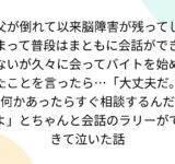 父が倒れて以来脳障害が残ってしまって普段はまともに会話ができないが久々に会ってバイトを始めたことを言ったら…「大丈夫だ。何かあったらすぐ相談するんだよ」とちゃんと会話のラリーができて泣いた話