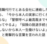 退職代行でとある会社に連絡したら、「今から本人の実家に行くからな」「警察呼べよ最高裁までやってやるよ」「保険の脱退手続きしないから本人一生働けないよ」と衝撃的な言葉を言われた話