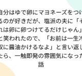 自分はゆで卵にマヨネーズをつけるのが好きだが、塩派の夫に「それは卵に卵つけてるだけじゃん」と笑われたので、「お前は一生冷奴に醤油かけるなよ」と言い返したら、一触即発の雰囲気になった話