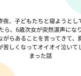 昨夜、子どもたちと寝ようとしてたら、6歳次女が突然涙声になりながらあることを言ってきて、胸が苦しくなってオイオイ泣いてしまった話