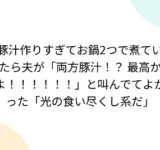豚汁作りすぎてお鍋2つで煮ていたら夫が「両方豚汁!? 最高かよ!!!!!!」と叫んでてよかった「光の食い尽くし系だ」