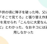 子供の頃に障子を破った時、父に「そこで見てろ」と張り替え作業を見せられ「こんなに大変なんだ」とわかった、なおネコには通用しなかった