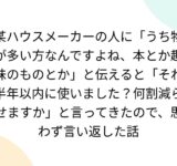某ハウスメーカーの人に「うち物が多い方なんですよね、本とか趣味のものとか」と伝えると「それ半年以内に使いました?何割減らせますか」と言ってきたので、思わず言い返した話