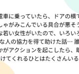 電車に乗っていたら、ドアの横でしゃがみこんでいる具合が悪そうな若い女性がいたので、いろいろな人の協力を得て助けた話… 誰かがアクションを起こしたら、助けてくれるひとはたくさんいる