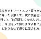 美容室でトリートメント買ったのに帰ったら無くて、次に美容室に行くと「前回渡してませんでした、今日持って帰りますよね?」と謝りもせず帰りに渡された