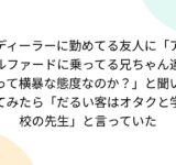 ディーラーに勤めてる友人に「アルファードに乗ってる兄ちゃん達って横暴な態度なのか?」と聞いてみたら「だるい客はオタクと学校の先生」と言っていた