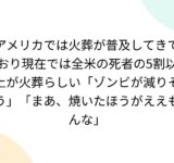 アメリカでは火葬が普及してきており現在では全米の死者の5割以上が火葬らしい「ゾンビが減りそう」「まあ、焼いたほうがええもんな」