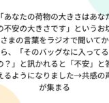 「あなたの荷物の大きさはあなたの不安の大きさです」というお坊さまの言葉をラジオで聞いてから、「そのバッグなに入ってるの?」と訊かれると「不安」と答えるようになりました→共感の声が集まる