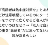 『高齢者は熱中症対策を』とあれだけ注意喚起しているのにクーラーをつけずに亡くなるご老人が絶えないのはなぜ?→『老人は自分の事を“高齢者”だと思ってない』説があるらしい