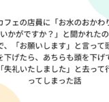 カフェの店員に「お水のおかわりいかがですか?」と聞かれたので、「お願いします」と言って頭を下げたら、あちらも頭を下げて「失礼いたしました」と去って行ってしまった話