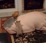 ブタの背中の上で遊ぶ…やんちゃな子猫たち(動画)