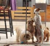 犬1匹では重くて開かないドア、4匹のチームワークで開ける(動画)