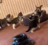子猫たちにジワジワ囲まれて…圧倒される犬(動画)
