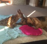 甘える子鹿、それを優しい目で見守る犬(動画)