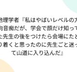 地理学者『私はやばいレベルの方向音痴だが、学会で顔だけ知ってた先生の後をつけたら会場にたどり着くと思ったのに先生ごと迷って山道に入り込んだ』