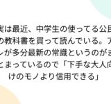 実は最近、中学生の使ってる公民の教科書を買って読んでいる。アレが多分最新の常識というのがまとまっているので「下手な大人向けのモノより信用できる」