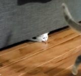 子猫、逆さにスライディングして他の猫を驚かせる(動画)