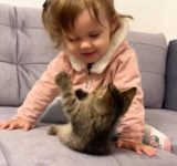 どちらも天使…子猫と女の子の赤ちゃんの初めての出会い(動画)