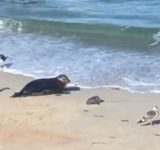 アザラシの赤ちゃんが初めての遊泳、それを見守るママ(動画)