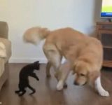 「やられたー!」猫に負けてあげる優しい犬(動画)