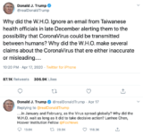 【新型コロナ】トランプ大統領Twitter「なぜWHOはコロナのヒト-ヒト感染を警告する台湾当局からのメールを無視したんだ?」