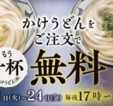 【お得】丸亀製麺 17時以降かけうどん(並、大、得)注文で「かけうどん(並)」を1 杯無料(21日火~24日金)
