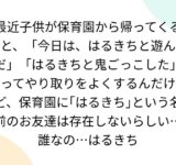 最近子供が保育園から帰ってくると、「今日は、はるきちと遊んだ」「はるきちと鬼ごっこした」ってやり取りをよくするんだけど、保育園に「はるきち」という名前のお友達は存在しないらしい… 誰なの…はるきち