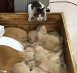 どちらもかわいい…猫のベビーシッターが犬の赤ちゃんたちを見守る(動画)
