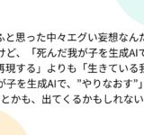 ふと思った中々エグい妄想なんだけど、「死んだ我が子を生成AIで再現する」よりも「生きている我が子を生成AIで、”やりなおす”」とかも、出てくるかもしれない