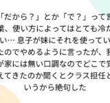 「だから?」とか「で?」って言葉、使い方によってはとても冷たい… 息子が妹にそれを使っていたのでやめるように言ったが、我が家には無い口調なのでどこで覚えてきたのか聞くとクラス担任というから絶句した
