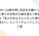 20〜22歳の頃に反出生主義だった周りの女性が25歳を超えて軒並み「恋人がお父さんになった姿が見たい」とシフトチェンジしていく話
