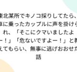 東北某所でキノコ採りしてたら、車に乗ったカップルに声を掛けられ、「そこにクマいましたよー!」「危ないですよー!」と教えてもらい、無事に逃げおおせた話