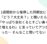 1週間前から復帰した同期女に『どう?大丈夫?』と聞いたら『やっぱり会社くるとすごい鼻くそ増えるわ』と言っていてアツかった… そんなこと聞いてない