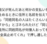 祖父が死んだあと何かの支払いを止めるときに住所と名前を伝えても「同姓同名の人はたくさんいますから」とゴネられたけど「同じ住所に同姓同名が何億人おっても全員止めてくれ」で押し通した