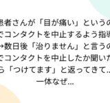 患者さんが「目が痛い」というのでコンタクトを中止するよう指導→数日後「治りません」と言うのでコンタクトを中止したか聞いたら「つけてます」と返ってきて…一体なぜ…
