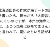 北海道出身の作家が海デートの話を書いたら、担当から「大変言いにくいのですが、本州の海岸には、ふつう昆布は落ちてません」と言われて、驚いたという話がある
