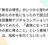 「無言の帰宅」がいつから使われ始めたのか気になったので国立国会図書館デジタルコレクションで調べてみたら、「遺体になって自分の家に帰ること」という意味では、昭和十年代ぐらいだった
