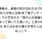 演奏中、楽器の弦が切れたので他の人の物と交換 終了後アンケートで小学生から「他の人の楽器を取って弾いてた悪い人」と言われる 本人はお気の毒だが見た人はほっこり