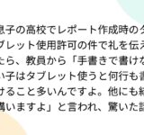 息子の高校でレポート作成時のタブレット使用許可の件で礼を伝えたら、教員から「手書きで書けない子はタブレット使うと何行も書けること多いんですよ。他にも結構いますよ」と言われ、驚いた話