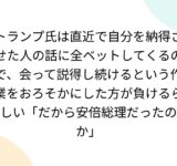 トランプ氏は直近で自分を納得させた人の話に全ベットしてくるので、会って説得し続けるという作業をおろそかにした方が負けるらしい「だから安倍総理だったのか」
