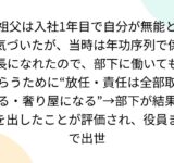 祖父は入社1年目で自分が無能と気づいたが、当時は年功序列で係長になれたので、部下に働いてもらうために“放任・責任は全部取る・奢り屋になる”→部下が結果を出したことが評価され、役員まで出世