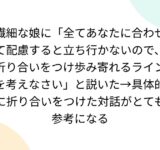 繊細な娘に「全てあなたに合わせて配慮すると立ち行かないので、折り合いをつけ歩み寄れるラインを考えなさい」と説いた→具体的に折り合いをつけた対話がとても参考になる