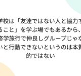 学校は「友達ではない人と協力すること」を学ぶ場でもあるから、修学旅行で仲良しグループじゃないと行動できないというのは本質的ではない